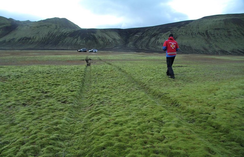 Í ljós kom að ökumaður bifreiðarinnar hafi ekið utan vega á stóru svæði. Talsverðar skemmdir urðu vegna akstursins á mosagrónu svæði en jarðvegurinn var mjög blautur og komu djúp hjólför í mosann eftir bifreiðina.