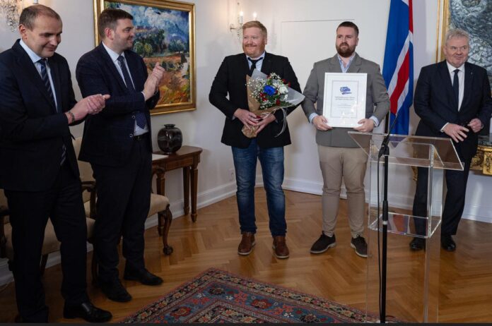 Gunnar E. Sigurbjörnsson, deildarstjóri frístundaþjónustu Árborgar og Arnar Helgi Magnússon, ráðgjafi hjá velferðarþjónustu Árborgar, tóku við verðlaununum úr hendi Sigurðar Inga Jóhannssonar, innviðaráðherra, við hátíðlega athöfn á Bessastöðum en þetta er í fyrsta skipti sem félagsmiðstöð hlýtur þessi verðlaun.