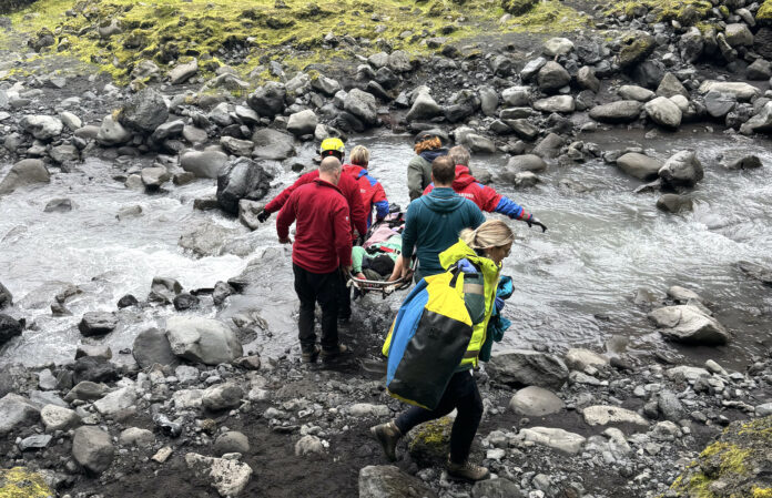 Slasaði ferðamaðurinn var fluttur með sjúkrabíl á slysadeild til aðhlynningar en björgunarsveitir höfðu lokið sinni vinnu á vettvangi upp úr klukkan 12.