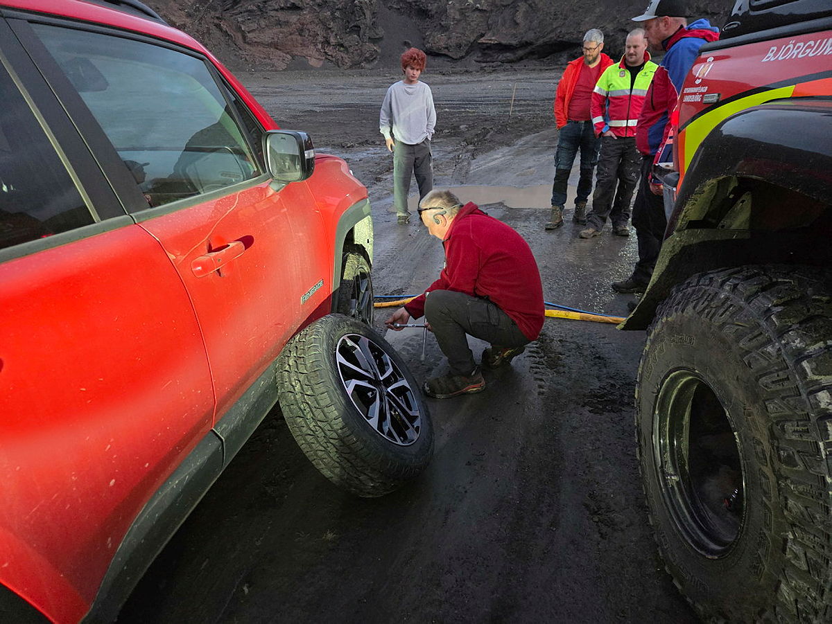 Björgunarsveitir nýttu sérstakan loftpúða til að lyfta bílnum í aurbleytunni og skipta um dekk og í framhaldinu var hann dreginn upp úr festunni.