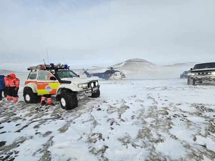 Talsverður skafrenningur var á slysstað og var hinn slasaði fluttur með björgunarsveitarbíl neðar í heiðina þar sem þyrlan gat lent vandræðalaust.