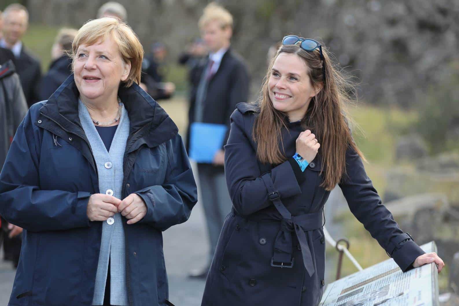 Katrín Jakobsdóttir, forsætisráðherra, tók á móti Angelu Merkel, kanslara Þýskalands, við Hakið á Þingvöllum í kvöld og gengu þær saman niður Almannagjá að ráðherrabústaðnum.
