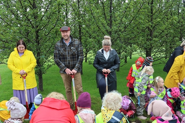 Þau Lilja Einarsdóttir, sveitarstjóri, Anton Kári Halldórsson, oddviti og Sólbjört S. Gestsdóttir, leikskólastjóri sáu um að taka skóflustunguna en þau voru þó alls ekki ein um verkið þar sem allir nemendur leikskólans voru mættir með skóflu í hönd og voru þau komin vel á veg með jarðvinnuna áður en yfir lauk. Börnin sungu einnig tvö lög sem þau voru búin að æfa fyrir tilefnið.