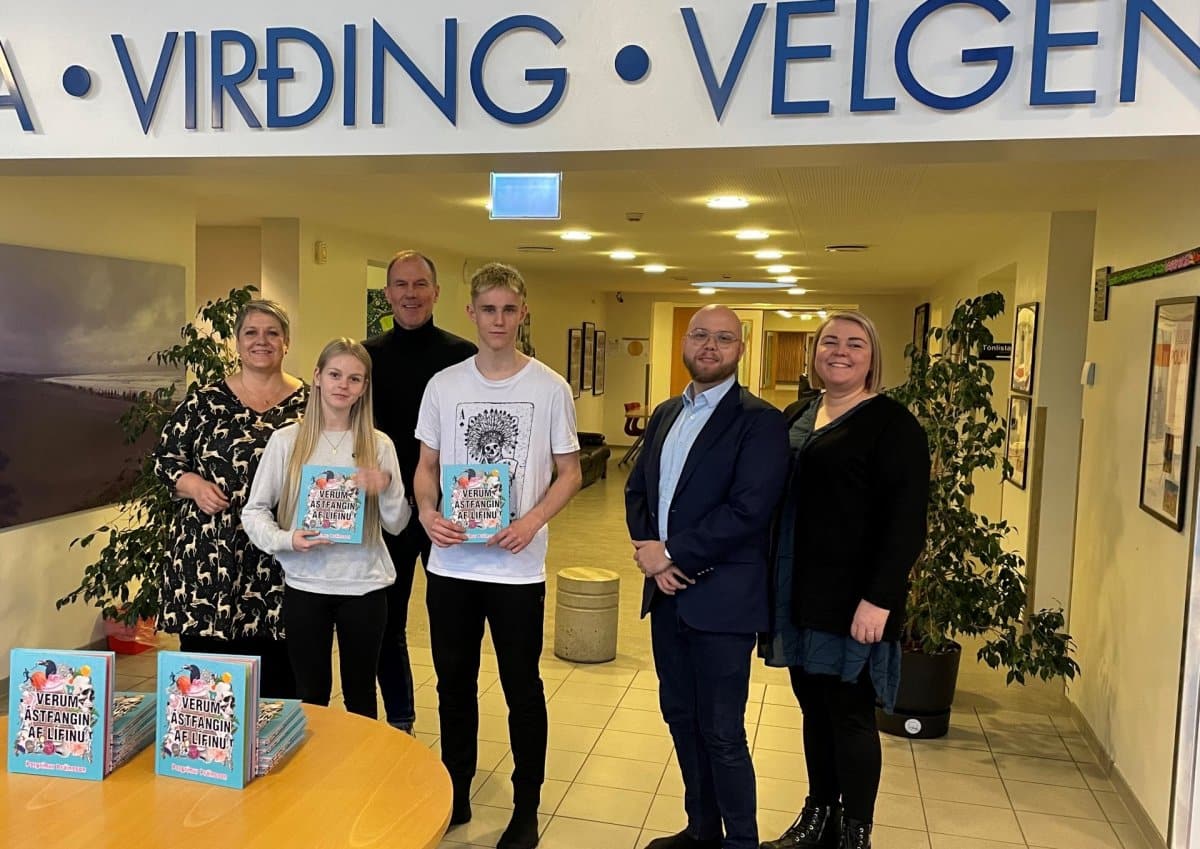 Skemmst er frá því að segja að fjölskyldan í Hafnarnesi-Veri tók vel í hugmyndina og í síðustu viku komu Katrín og Ólafur Hannesarbörn í heimsókn í skólann og afhentu bókina að gjöf til allra nemenda á unglingastigi. Skólinn hafði einnig samband við Þorgrím, sem var ekki lengi að bregðast við og kom í skólann og ritaði persónulega kveðju inni í hverja einustu bók.