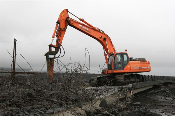 Það var Framrás ehf í Vík sem sá um að brjóta brúargólfið og Fura í Hafnarfirði mun svo sjá um að fjarlægja steypustyrktarstálið sem eftir er.
