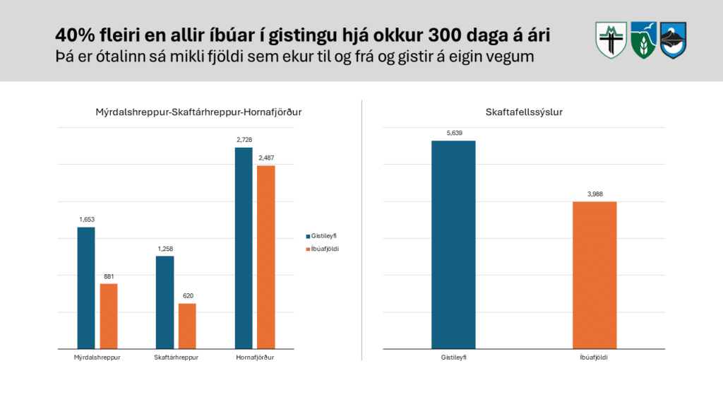 Í sveitarfélögunum þremur er íbúafjöldi 4.200. Til samanburðar eru útgefin gistileyfi á svæðinu yfir 5.600. Þetta þýðir að ferðamenn sem gista á hótelum og gistiheimilum á hverri einustu nóttu, nánast allt árið um kring, eru 40% fleiri en íbúar sveitarfélaganna. Þá er ótalinn sá mikli fjöldi sem gistir í heimagistingu, í ferðavögnum eða tjöldum, svo ekki sé talað um þá sem aka um svæðið en gista ekki.