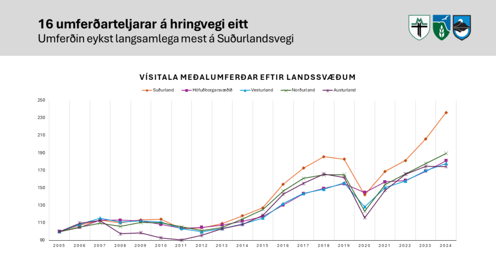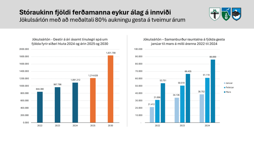 Hér fyrir neðan má sjá nokkrar töflur sem birtar voru á fundinum og sýna meðal annars stóraukna meðalumferð á Suðurlandi og aukinn gestafjölda í Jökulsárlóni.
