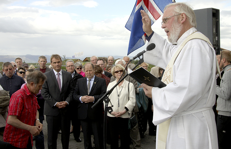 Síðdegis í dag söfnuðust gestir saman við Sesseljuhús og gengu síðan að nýjasta húsinu á staðnum, Tómasarsmiðju. Fánaberarnir Reynir Pétur og Gústi fóru fyrir skrúðgöngunni ásamt félögum úr lúðrasveitinni Svan.