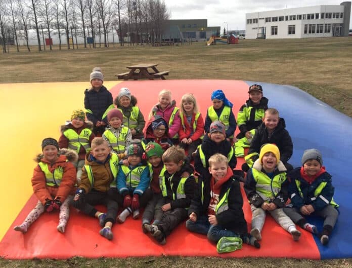 Þau aðstoðuðu einnig sveitarstjórann Anton Kára Halldórsson við að kveikja á ærslabelgnum sem hefur legið í dvala yfir vetrartímann.