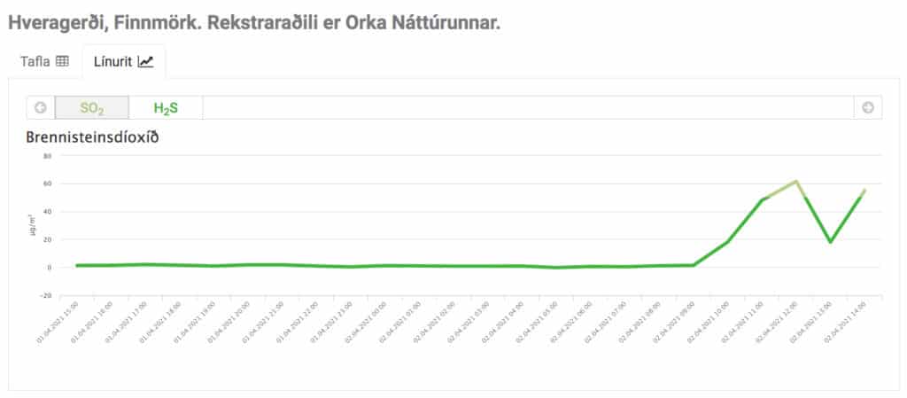 Styrkur brennisteinsdíoxíðs í andrúmsloftinu fór niður á við eftir hádegi en steig svo aftur og var í 54,9 µg/m³ kl. 14.
