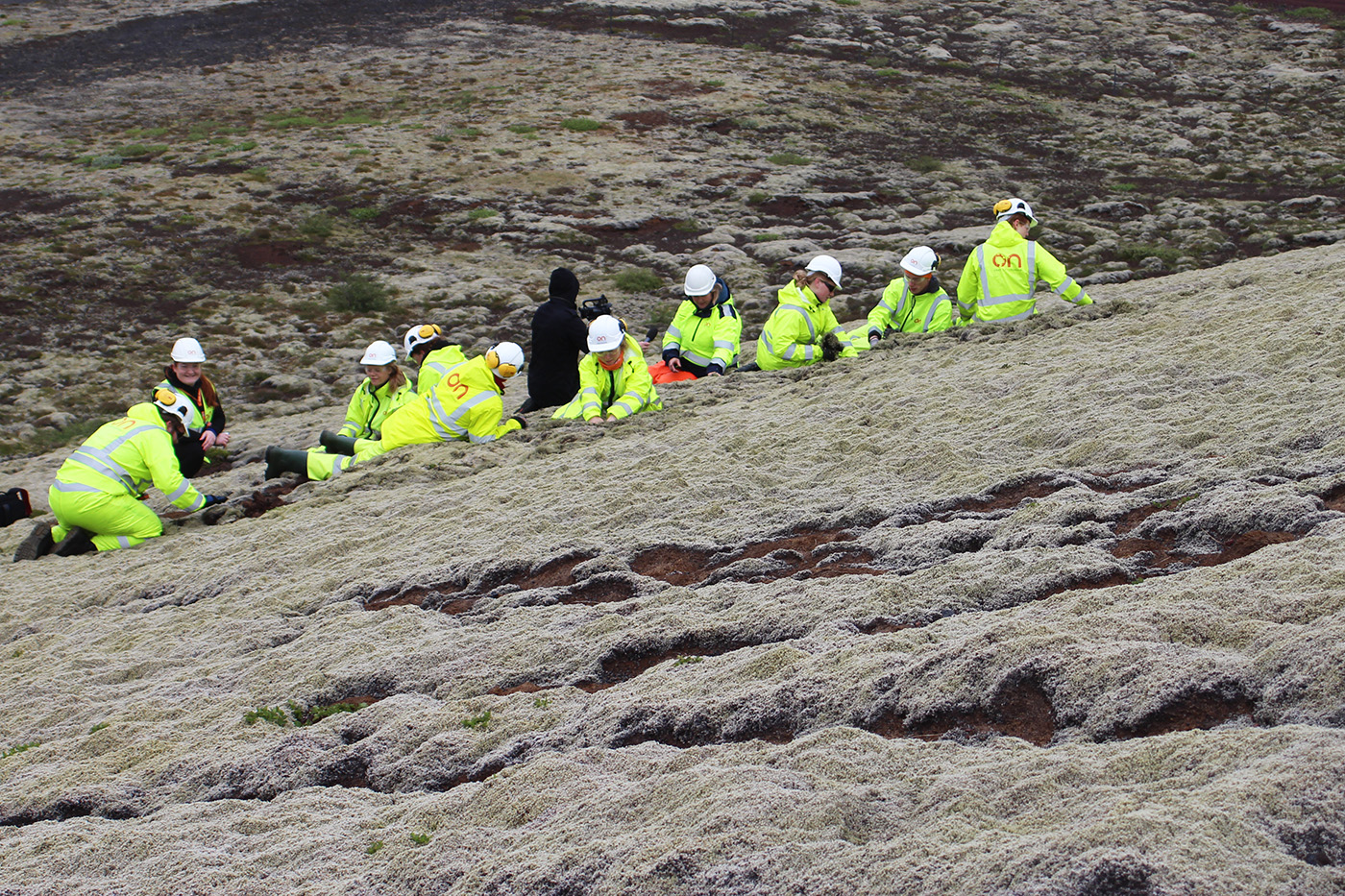 „Við ætlum að freista þess að lagfæra skemmdirnar og byrjuðum björgunarverkefnið í dag. Litlar mosaþúfur voru teknar umhverfis stafina, sem höfðu verið krotaðir í mosann, og þær notaðar til að fylla í þá og þannig lokuðum við sárinu. Ég hef verið að prófa mig áfram með aðferðir við að laga svona mosakrot og mér sýnist að þessi aðferð virki vel. Það tekur samt mosaþembuna nokkur ár að jafna sig alveg. Við leggjum okkur fram við að miðla þekkingu okkar í þessum málum og ætlum að útbúa stutt kynningarmyndband sem sýnir að hver sem er getur tekið sig til og lagfært mosakrot,“ segir Magnea Magnúsdóttir, umhverfis- og landgræðslustjóri Orku náttúrunnar.