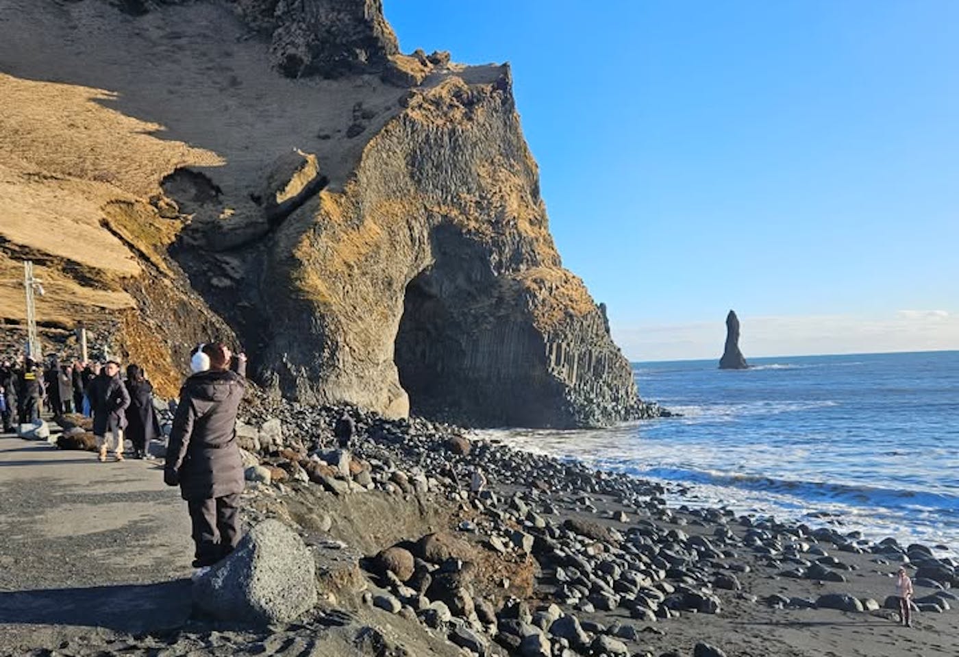 Gríðarlegt landrof hefur orðið í Reynisfjöru í Mýrdal síðustu daga og í síðustu viku hrundi stór bakki úr hlíðum Reynisfjalls niður að viðvörunarskiltunum við fjöruna.