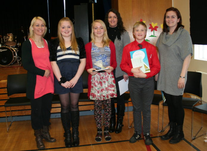 Á meðfylgjandi mynd eru sigurvegarnir ásamt kennurum sínum. F.v. Sigríður Theodóra Kristinsdóttir kennari í Grunnskólanum á Hellu, Bjarnveig Björk Birkisdóttir úr Grunnskólanum á Hellu sem lenti í 2. sæti, Guðbjörg Viðja Antonsdóttir úr Laugalandsskóla sem lenti í 1. sæti, Kolbrún Sigþórsdóttir aðstoðarskólastjóri í Laugalandsskóla, en hún hefur þjálfað nemendur í Laugalandsskóla í 10 ár og átt sigurvegara í 1. sæti öll árin, Dagur Ágústsson úr Hvolsskóla sem lenti í 3. sæti og kennari hans Anna Kristín Guðjónsdóttir.
