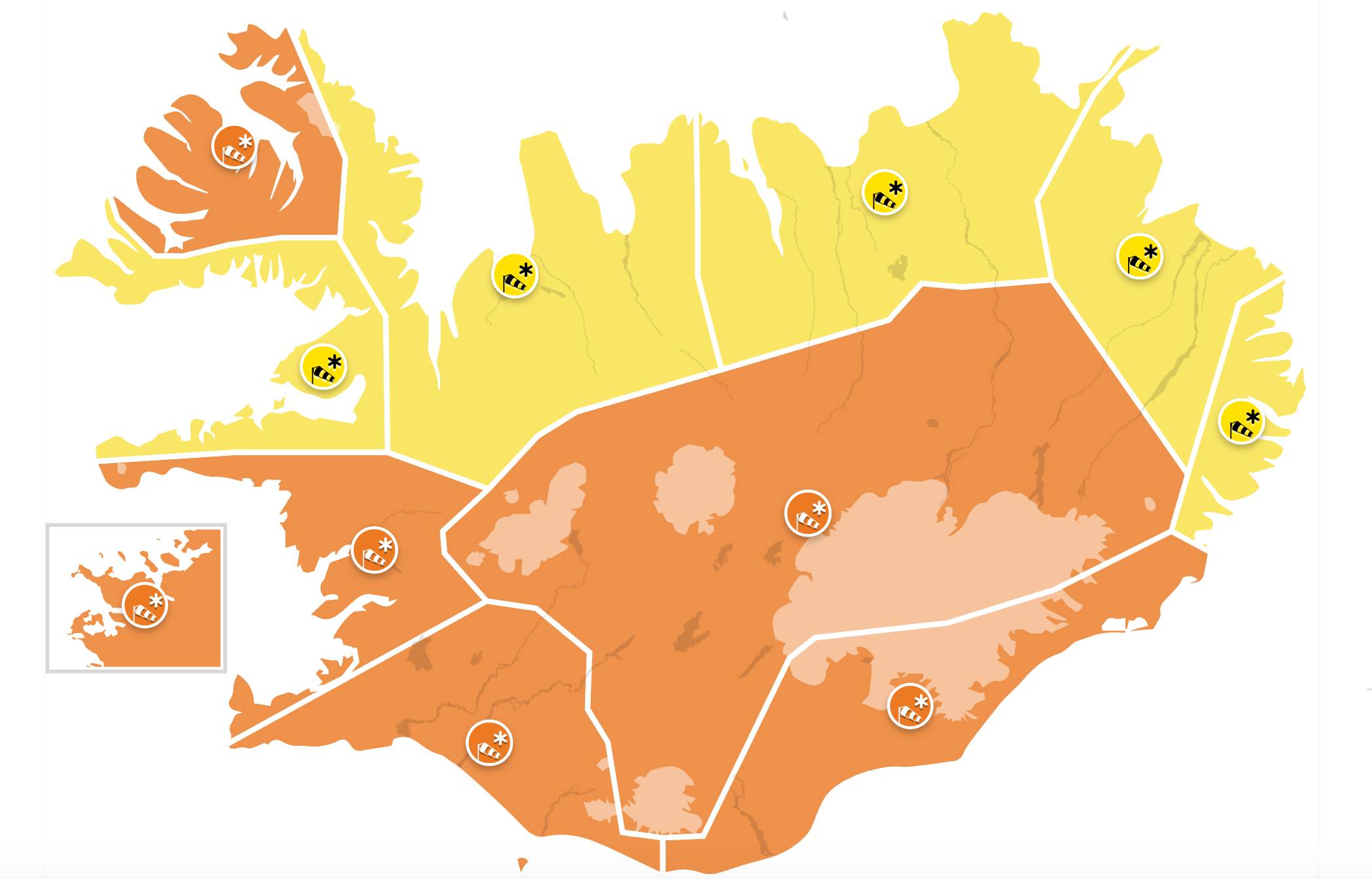 Viðvörunarstig hefur einnig breyst á Suðurlandi, appelsínugul viðvörun gildir sem áður á milli 7 og 13 en á undan henni, milli 5 og 7 er nú gul viðvörun í gildi.