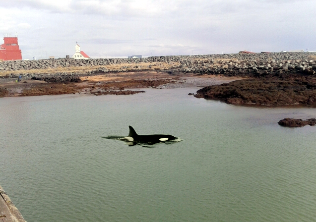 Háhyrningur hefur verið á sundi í höfninni á Stokkseyri eftir hádegi í dag. Fjöldi fólks er á bryggjunni og fylgist með.
