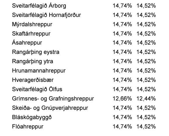 Öll sveitarfélögin á Suðurlandi leggja hámarksútsvar á íbúa sína á árinu 2023, 14,74 prósent, fyrir utan Grímsnes- og Grafningshrepp, en þar er útsvarsprósentan 12,66 prósent.
