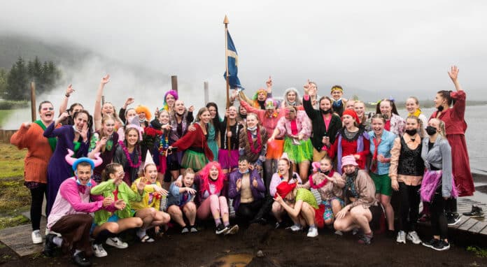 Það voru því kátir ML-ingar sem héldu í gleðigöngu á dögunum og vígðu fyrsta árs nema inn í skólasamfélag Menntaskólans að Laugarvatni. Að vanda fylgdi Hvítbláinn, skólafáni ML hópnum. Hlýtt var í veðri þennan dag, en hellirigning þannig að nemendur urðu vel votir áður en í vatnið var farið.