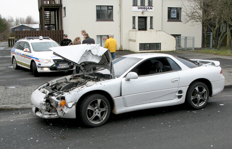 Þarna var fólksbíl ekið aftan á stóran amerískan pallbíl, þannig að fólksbíllinn fór undir vinstra afturhorn pallbílsins og sneri honum á götunni. Fimm voru í pallbílnum og kenndu þeir sér ekki meins en ökumaður fólksbílsins var einn á ferð og var hann fluttur á heilsugæsluna á Selfossi til skoðunar. Hann er ekki talinn alvarlega slasaður.