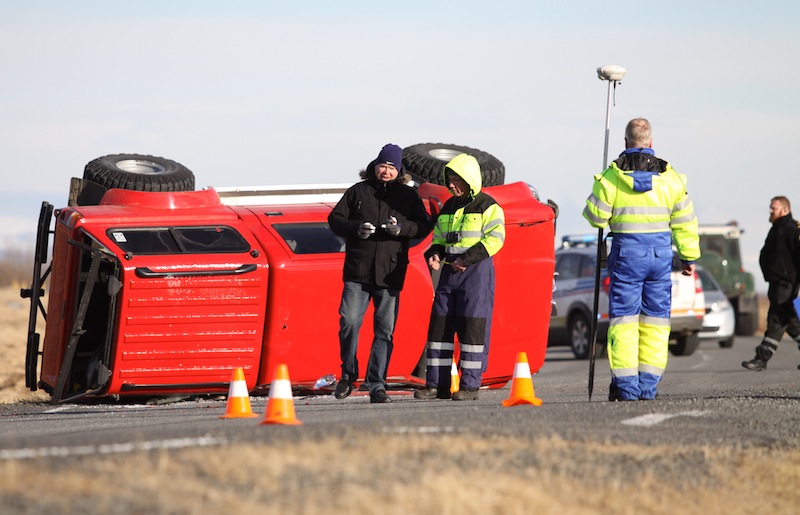 Hinir slösuðu voru allir í fólksbílnum, sem hafnaði utanvegar en jeppinn valt við áreksturinn. Tveir voru í jeppanum og sluppu þeir án meiðsla.