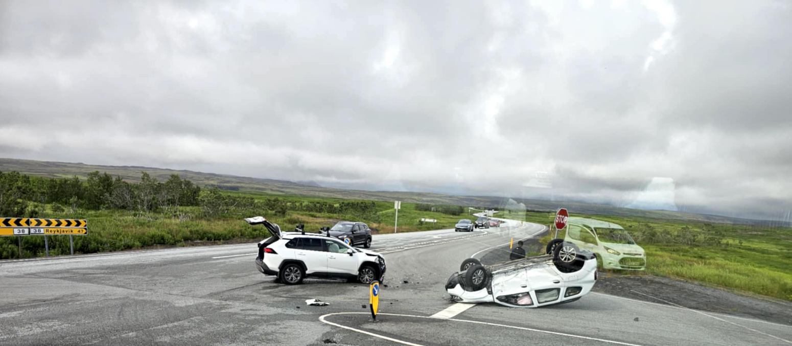 Samkvæmt upplýsingum frá lögreglunni á Suðurlandi voru tveir í öðrum bílnum og einn í hinum og reyndust meiðsli fólksins minniháttar. Bílarnir eru hins vegar mikið skemmdir eftir áreksturinn og hafnaði annar þeirra á hvolfi.