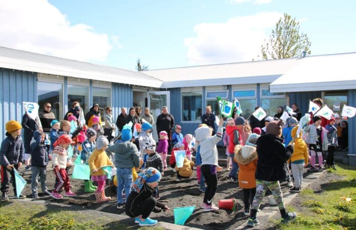 Börnin á leikskólanum voru með fána sem þau höfðu sjálf gert úr trjágreinum og því efni sem þau fundu og gátu endurunnið. Sungu þau síðan nokkur lög í tilefni dagsins sem þau voru búin að æfa.