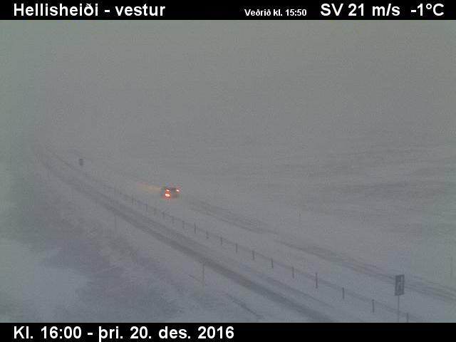 Mjög djúp lægð hefur legið skammt vestur af landinu og sunnan lægðarmiðjunnar er vindstrengur með vestan stormi sem kom inn á landið um miðjan dag. Reiknað er með hríðarveðri og litlu skyggni á fjallvegum fram á kvöld.