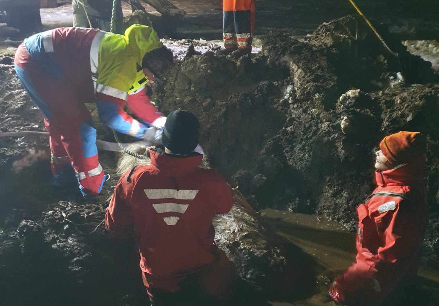 Hesturinn hafði fallið í gjótuna en var bjargað lifandi í hús. Yngra tryppi var dautt í gjótunni þegar bóndinn kom að þeim. Notast var við skotbómulyftara af næsta bæ og traktorsgröfu til að sinna verkinu.