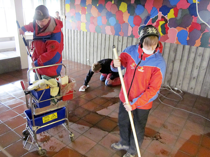 Von á slökkvibílum, sem byrja á því að þrífa leikskólann, skólann og dvalarheimili aldraðra á Klaustri. Aðstoð slökkviliðanna við hreinsunarstörf er einnig að hefjast.