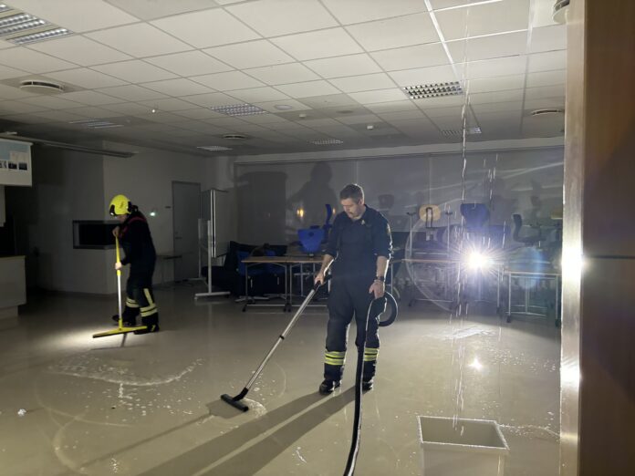 „Það eru nokkur hitablásarakerfi í húsinu, í tæknirýmum inni í húsi og í skúrum uppi á þaki. Það gaf sig element í einni af þessum stæðum uppi á þaki, þannig að það lak vatn ofan í loftræstikerfið og síðan eins og það liggur eftir húsinu,“ segir Hermann Örn Kristjánsson