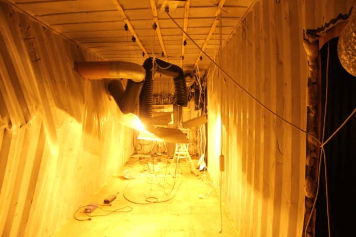 Leitað var í tveimur niðurgröfnum gámum sem voru þannig útbúnir að búið var að byggja smáhýsi ofan á þá til að fela ummerki um loftræstingu og annað sem tilheyrir ræktun kannabisplantna.