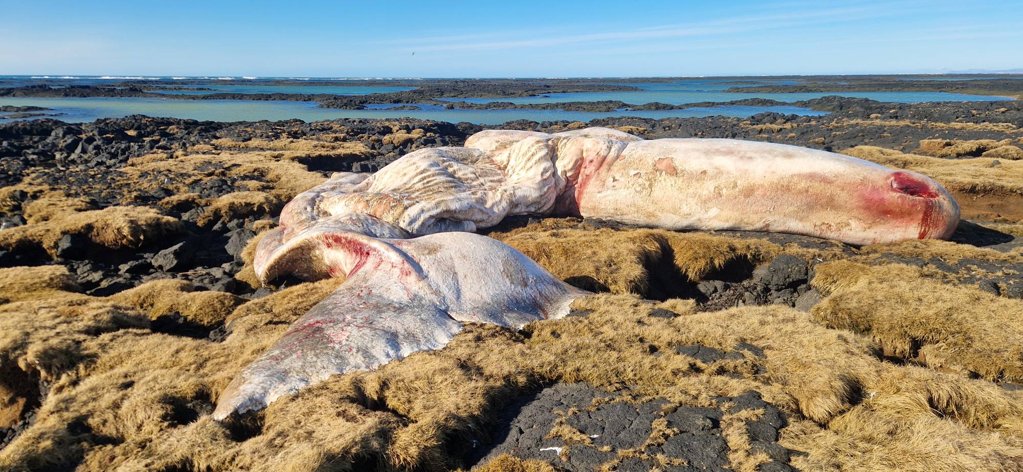 Hvalurinn er um það bil 15 metra langur og hefur rekið dauðann á land ef eitthvað er að marka ummerkin.