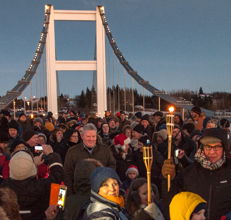 Í lok athafnarinnar á brúnni hófu gestir kyndlana 32 á loft og héldu í blysför í Dýragarðinn í Slakka þar sem húsráðendur tóku við gestunum af einstökum höfðingsskap og velvild, eins og þeim er lagið. Fyrir utan heitt kakó, kaffi og smákökur sem Slakkafólkið bauð gestum, lögðu fjölmargir íbúar í Skálholtssókn allskyns góðgæti á borð í því sem kallast mun „Pálínuboð“.