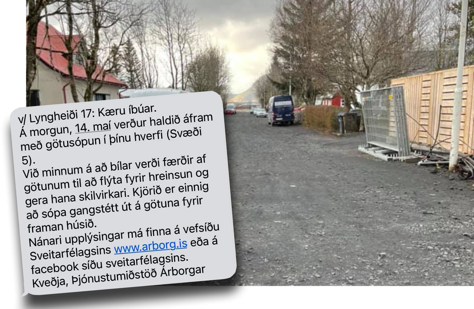 Það væri kannski ekki í frásögur færandi fyrir utan það að Lyngheiðin er „fokheld“ vegna framkvæmda í götunni sem staðið hafa síðan síðasta sumar. Það er því mjög líklegt að götusóparabíllinn muni eiga erfitt með að athafna sig í götunni – ef hann á annað borð leggur í hana.