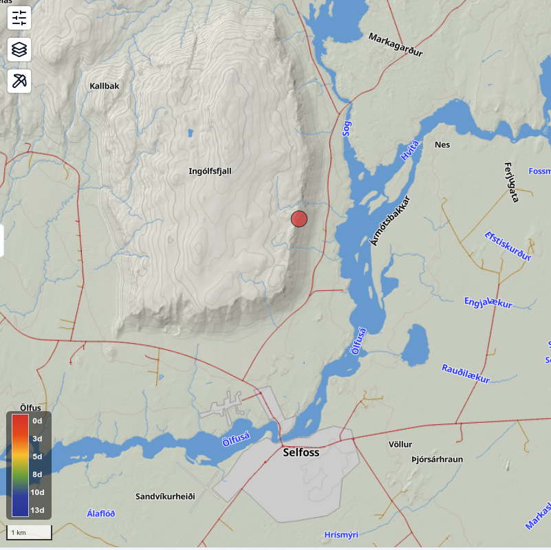 Skjálftinn fannst vel á Selfossi en upptök hans voru í fjallsbrúninni fyrir ofan Tannastaði í Ölfusi á 1,2 km dýpi.