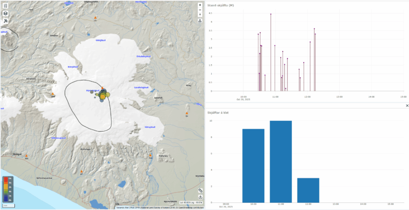 Um klukkan hálf ellefu í morgun hófst nokkuð kröftug jarðskjálftahrina í Mýrdalsjökli. Nokkrir skjálftar hafa mælst yfir 3 að stærð og sá stærsti, af stærðinni 4,4 er sá öflugasti á svæðinu frá því í maí 2023.