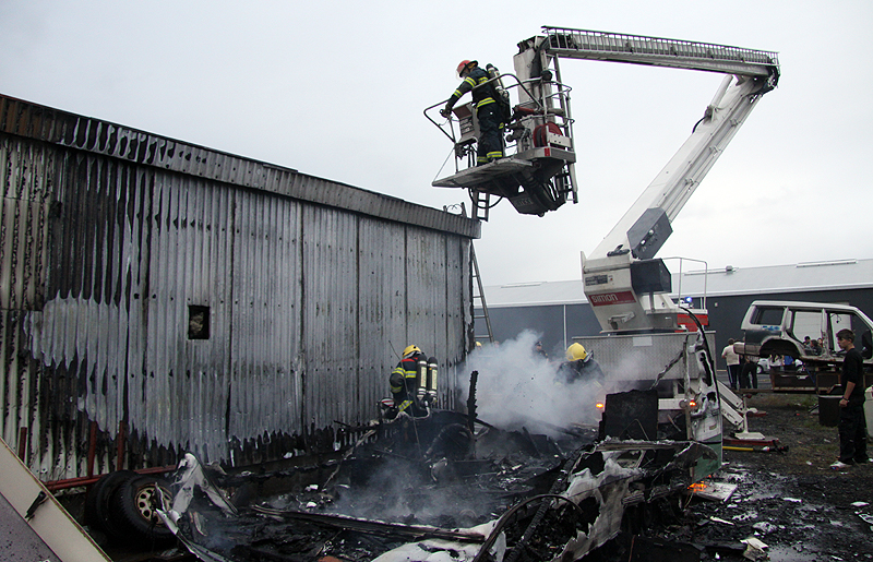 Eldurinn hafði náð að svíða viðarklæðningu undir járnklæðningu á húsinu og virtist á tímabili vera kominn í þakið. Svo var ekki og rifu slökkviliðsmenn járnklæðninguna frá til að komast að viðarklæðningunni.