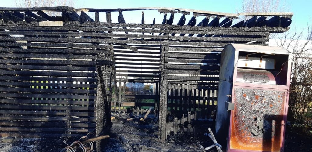 Brunavarnir Árnessýslu á Selfossi fengu boð um eldinn klukkan 5:38 í morgun og var ruslageymslan þá alelda. Eldurinn náði að læsa sig í sambyggða geymslu en þar urðu engar skemmdir innan dyra, en í geymslunni er nær allur búnaður Fossbúa geymdur.