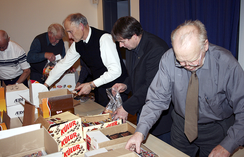 Á myndinni með fréttinni eru Jón Valmundsson, Einar Kjartansson, Eyjólfur Sigurjónsson, Karl Pálmason og Sigþór Sigurðsson við nammipökkunina.