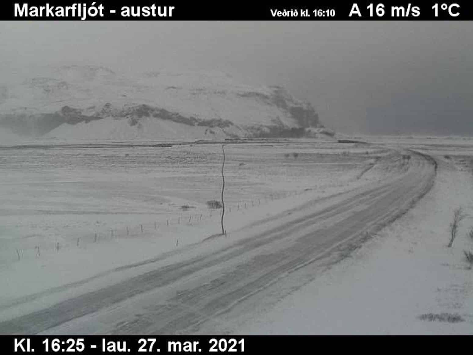 UPPFÆRT KL. 00:15: Búið er opna á ný Suðurlandsveg frá Hvolsvelli að Markarfljóti. Á svæðinu er þó enn slæmt veður með miklum vindhviðum og á veginum eru bæði hálka og snjór skafinn í skafla. Þjóðvegurinn verðir áfram lokaður frá Markarfljóti að Vík í Mýrdal til morguns.