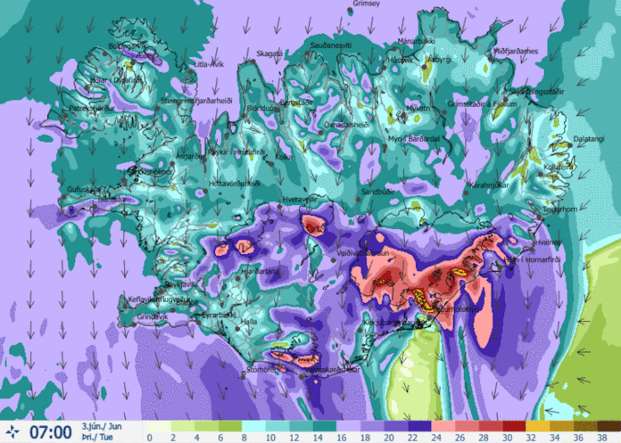 Í nótt og á morgun verður hvassast undir Vatnajökli, norðan 18-25 m/sek með hviðum yfir 40 m/sek og hættulegar aðstæður fyrir ökutæki.