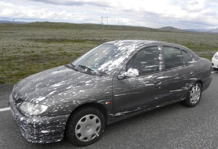 Atvikið átti sér stað á Suðurlandsvegi, skammt norðan Bláfjallaafleggjarans, eftir hádegi sl. fimmtudag, 24. júní. Þar féll málningarfata af ökutæki og slettist úr henni á nokkra bíla sem á eftir komu.