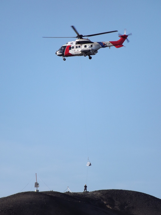 Landhelgisgæslan flaug með búnaðinn og hluta af mannskapnum upp á Entu sem er norðan við Kötluöskjuna. Þar voru settir niður rafgeymar og komið á samskiptum við skjálftastöðina. Ekki þurfti að skipta um búnað á GPS stöðinni.