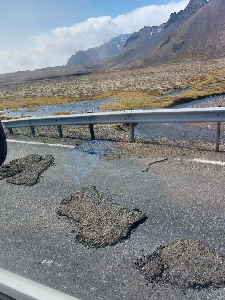 Meðfylgjandi eru nokkrar myndir frá Slysavarnafélaginu Landsbjörgu sem teknar voru í Öræfum í morgun. Meðal annars mynd sem sýnir hvernig hluti yfirlags vegar hefur fokið upp og liggur á hvolfi.
