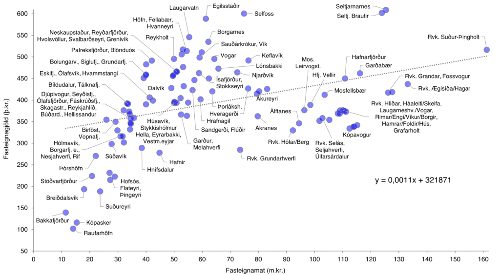 Þó fasteignagjöld séu ekki í fullkomlega beinu flútti við fasteignamat eru nokkuð sterk línuleg tengsl milli heildarfasteignamats og heildarfasteignagjalda viðmiðunareignarinnar eins og sjá má á punktaritinu hér að neðan. Línan sem dregin er í gegnum punktana 103 er aðhvarfslína og matssvæði þar sem fasteignagjöld eru frábugðin öðrum stöðum með sambærilegt fasteignamat lenda þá langt fyrir ofan eða neðan línuna.