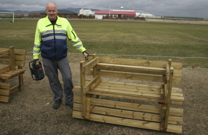 Sveitarfélagið keypti stúkurnar í vetur eftir tillögu Björns Inga Bjarnasonar, menningarnefndarmanns. Stúkurnar eru smíðaðar í fangelsinu á Litla-Hrauni en um er að ræða þrisvar sinnum 33 trébekki. Verða með þessu til þrjú sett, hvert sett með 99 sætum, samtals 297 sæti.
