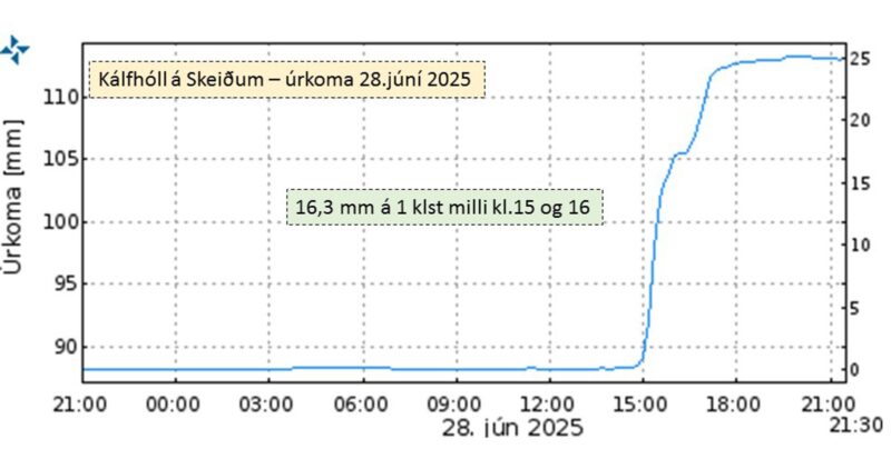 Á milli klukkan 15 og 16 í gær mældist úrkoma á Kálfhóli á Skeiðum 16,3 mm. Þetta er meira en áður hefur mælst á svo skömmum tíma á stöðinni.