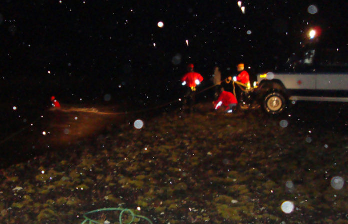 Útkallið barst um kvöldmatarleytið og mennirnir voru komnir á land milli klukkan 22 og 23. Björgunarstörfum lauk hins vegar ekki fyrr en rúmlega 6 í morgun þar sem langan tíma tók að koma jarðýtu á staðinn til þess að losa bílinn.