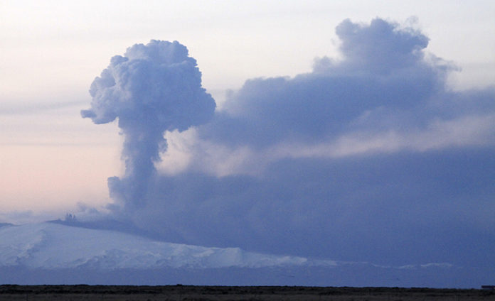 Ekkert hefur sést til gosstöðva í dag en gosmökkurinn liggur í 6-7 km hæð og rís beint upp af gosstöðvum. Í könnunarleiðangri í gær var töluvert gjóskufall sunnan við Goðastein og færðist það vestar þegar leið á daginn. Eldingar voru tíðar og fylgdu þeim þrumur.