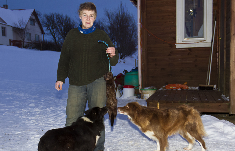 Tíkurnar hennar Guðrúnar, þær Nóra, sem er Border Collie fjárhundur, og Nala, sem er skosk-íslensks, voru snöggar til og höfðu upp á minknum. „Ég náði einhvernveginn að festa hann þarna á milli með skójárni sem ég greip, og hundarnir náðu honum í kjölfarið,“segir Guðrún. Líf minksins varð ekki lengra.