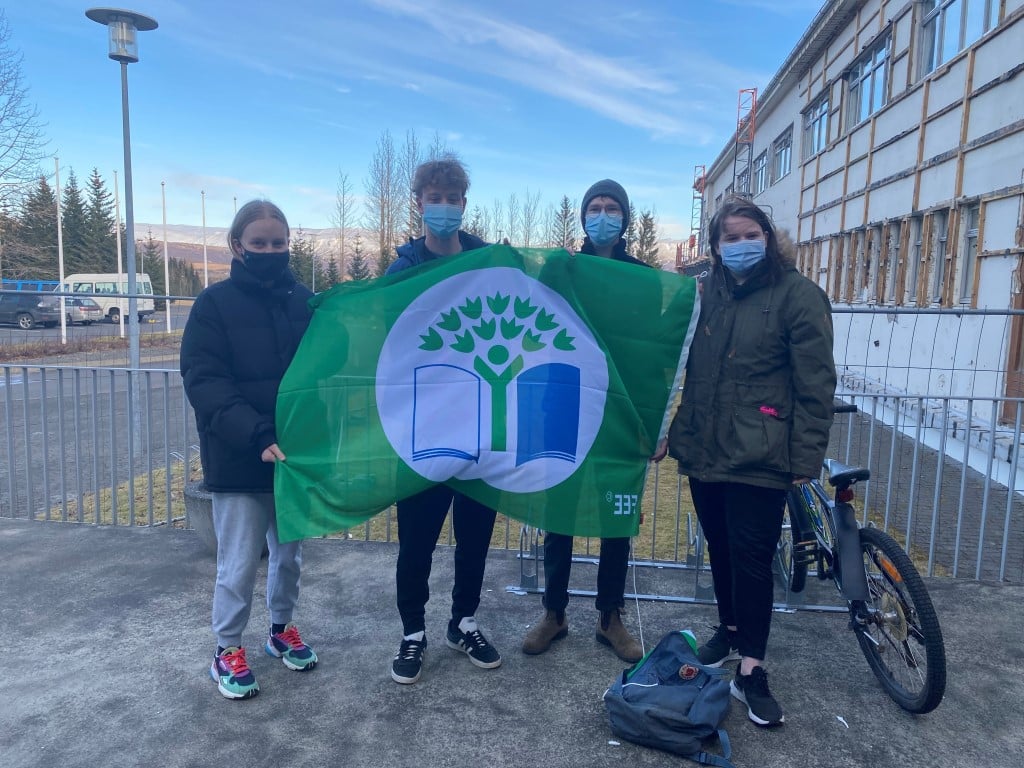 Það var Sigurlaug Arnardóttir frá Landvernd sem færði nokkrum nemendum úr umhverfisnefnd ML fánann og viðurkenningarskjal.